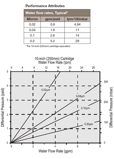 8.8ft2 (0.82m2) 0.02m pore size per 10 (250mm) cartridge