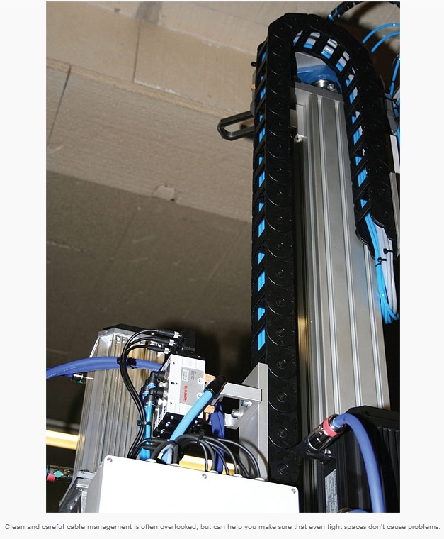 Cable management is one of the most frequently overlooked attributes in mechatronic systems. Don't make this mistake—it can be costly. Cables and cable tracks require physical space, and fast, multi-axis motion often requires cables that can handle tight bends and high-duty cycles.