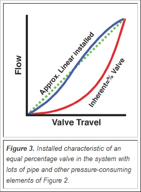 The symptom of a misapplied control valve flow characteristic is a control loop that only gives good control at one end of its operating range and is either sluggish or becomes unstable at the other end of its operating range. An example of a misapplied valve inherent flow characteristic would be an equal percentage valve in a system with very little piping. The left-hand graph of Figure 4 shows the resulting non-linear (equal percentage) installed flow characteristic, which is very undesirable.