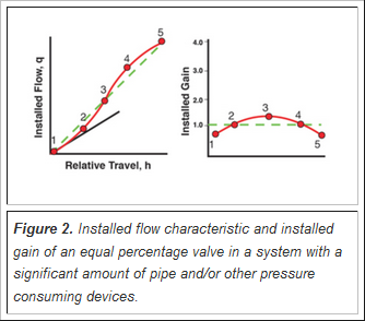 Typically, the installed characteristic and installed gain graphs of equal percentage valves in systems with a lot of pipe (and/or other pressure-consuming elements), which is the most common case, will have shapes similar to those in Figure 2, but not necessarily as symmetrical as shown in the figure.