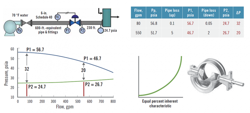 To demonstrate this, we'll consider the system shown in Figure 1. This is a system with a centrifugal pump and a significant amount of pipe, both upstream and downstream of the control valve. A static analysis shows that as flow changes, the valve inlet and outlet pressures (P1 and P2) change as shown in the Figure 1 table and graph.