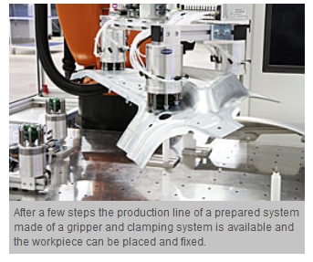 At the start of the gripping process, the positioning pins are adapted to the workpiece geometry. The suction cup uses a compressed air suspension to initially extend the pins and then to fix according to the desired position by interrupting the compressed air. The contour of the workpiece is obtained by the suction cup from the robot software. After a few seconds, the pins form the outline of the workpiece - it is an automatically prepared gripping system. In order to adjust a clamping system for the same workpiece contour, the pins are initially positioned in the same way. The gripper moves over the congruent built clamping system. The gripper pushes the pins of the clamping system in all at once until the negative contour of the gripping system is achieved. This way the workpiece can be gripped from above and clamped from below.