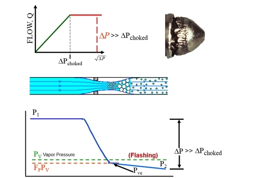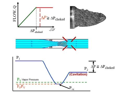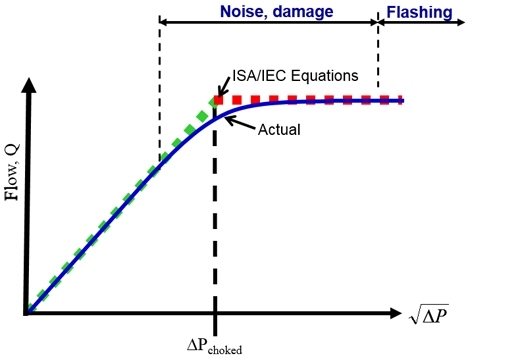 Figure 1 and the associated discussion of liquid-choked flow is the classical discussion and implies that there is a sudden transition from non-choked flow to fully choked flow. In reality, at pressure drops approaching, but below the calculated value of ΔPchoked, there is usually some formation of vapor bubbles and some degree of cavitation. Figure 5 shows what really happens as flow transitions from non-choked to fully choked flow. Figure 5 shows what really happens as flow transitions from non-choked to fully choked flow.