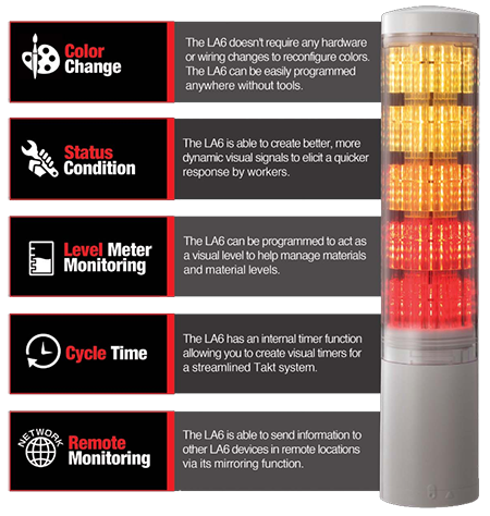 The LA6 was designed to solve the drawbacks of traditional stack lights, one drawback being that individual stack light modules can be difficult to see across large plant floors. To fix this issue, the LA6 can be programmed to display one single, solid color throughout the entire unit when an error occurs, making it highly visible even from the farthest ends of a factory.