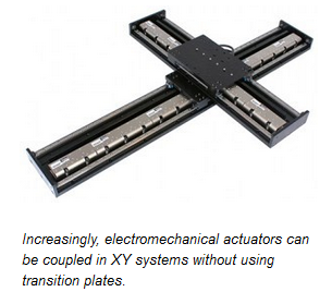 Electromechanical actuators are almost never designed into a machine without being connected to other actuators or other mechanical devices. Being able to combine linear actuators into XY, XZ, or XYZ assemblies quickly and effortlessly is critical to machine builders. Most modern motion components are designed to be bolted together like motion building blocks, without the use of transition plates for XY systems. However, to maintain stability, plates are often unavoidable for the Z or vertical axes.