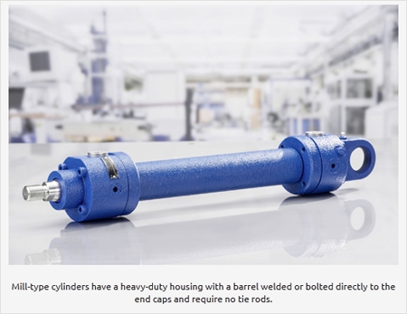 Welded or mill-type cylinders have a heavy-duty housing with a barrel welded or bolted directly to the end caps and require no tie rods. Designed for higher pressures, to 5,000 psi or greater, they are generally preferred in more rugged applications such as presses, steel mills, and offshore settings with harsh environments and wide temperature swings.