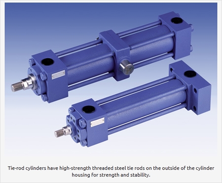 Tie-rod cylinders use high-strength threaded steel tie rods on the outside of the cylinder housing for additional strength and stability. In the U.S., this is the most common cylinder type. They're used on most general industrial applications, such as plastics machinery and machine tools, although they tend to be limited to 3,000 psi maximum operating pressure. The cylinders are built to NFPA standards, which makes their dimensions and pressure ratings interchangeable with any other cylinder built to that standard.