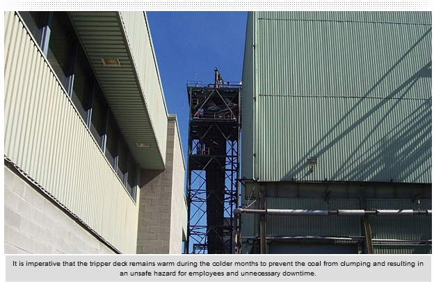 In addition to being an inefficient use of the power plant employees time, cleaning the chutes in this manner was dangerous and not compliant with OSHA standards. Workers would climb the four-story coal chutes, banging on the sides to loosen the clumps, and reach in and clear the chute once they reached the top. A better solution was needed, one that would prevent the coal from clumping. The company felt it was imperative that the tripper deck remain warm during the colder months to eliminate the hazardous situation for the plant workers and cut unnecessary downtime. As a first attempt to remedy the condition, the power plant placed strip heaters along the sides of the coal chutes. Unfortunately, strip heaters are an inappropriate solution: they are not engineered for this purpose, nor do they meet the C1D2 hazardous area classification with the presence of dust. Valin Corp. is a distributor and technical solutions provider of automation, filtration, fluid handling, fluid power, heating and process control products and systems. Each year, the company travels the western United States with its mobile technology vehicle, a rolling solutions laboratory equipped with solutions to eliminate process waste and improve efficiency, enable reliable plant networking, streamline equipment communications, and automate and regulate process conditions. As a part of one of its annual tours, Valin visited the power plant with its mobile technology vehicle. While there, the power plants engineering firm learned how to specify heat trace cable, and how to choose the proper cable type for each application. As time went on, the power plants engineering firm recruited Valin to develop a safe solution that would keep the walls of the coal chute from freezing and prevent the coal from clumping. Valin suggested adding heat tracing to the coal chutes, installing insulation around the coal chutes, and adding an electronic control system that would help extend the life of the heat trace cables. Convinced of the need for heat tracing, the power plant gave the distributor the go ahead. In 2011, Valin began the project with engineering and design, isometric drawings and a close look at requirements for safety, personnel and other factors. Using pre-engineering calculations, the team selected heat tracing products from Pittsburgh-based Chromalox. The company specified Chromaloxs SRM/E, a self-regulating medium-temperature heat tracing cable, for the coal chutes. The mid-range wattage cable will maintain a temperature of 40F (4C) in the coal chutes.